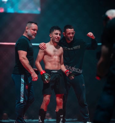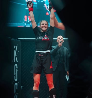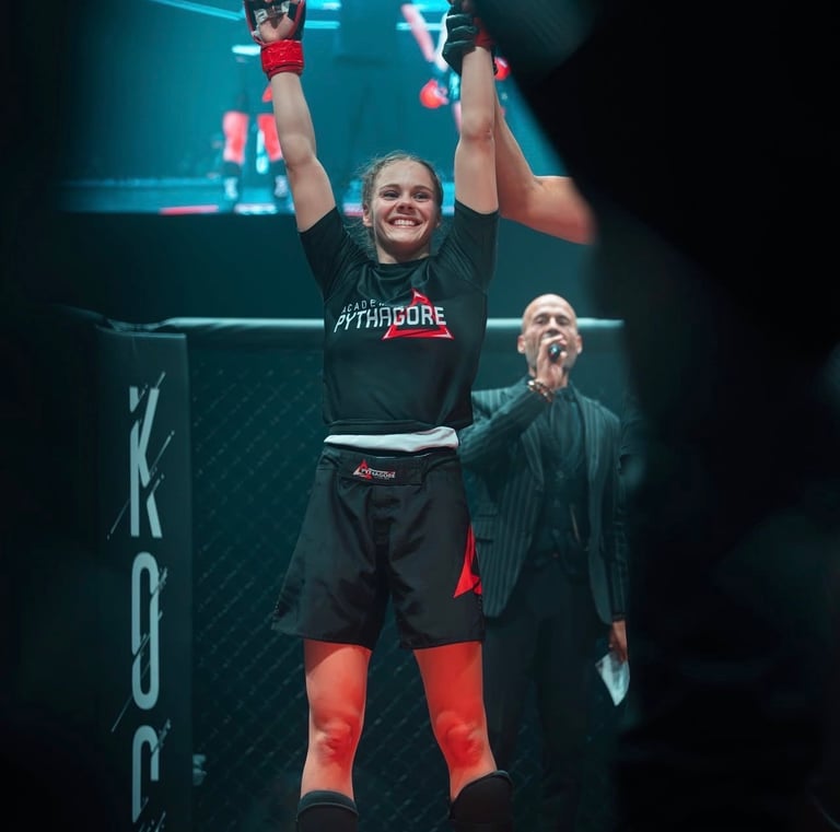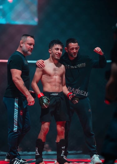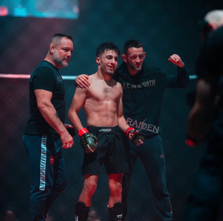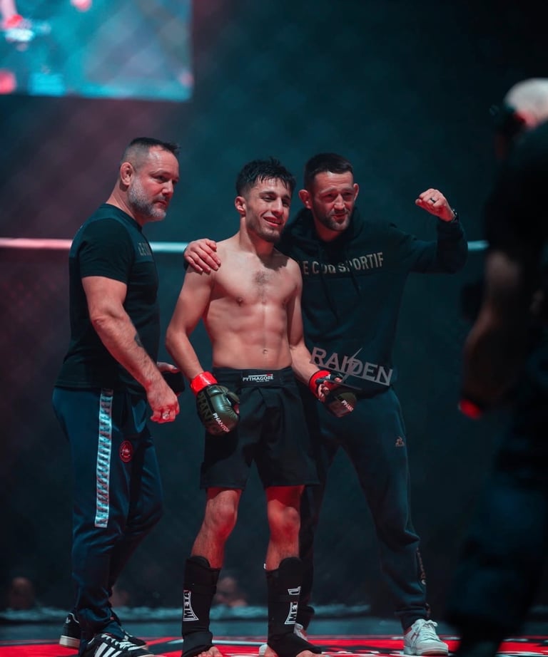 En 2003, je débute le MMA au Cage Warriors 4, où je remporte mon premier combat par soumission. Je poursuis ensuite plusieurs combats professionnels et décroche une première ceinture mondiale au Cage Warriors 7, ce qui me vaut le surnom de « Pythagore ». Je remporte d’autres victoires marquantes, notamment au Cage Rage, puis combats au Japon en 2006, où je gagne le respect du public pour mon esprit combatif.